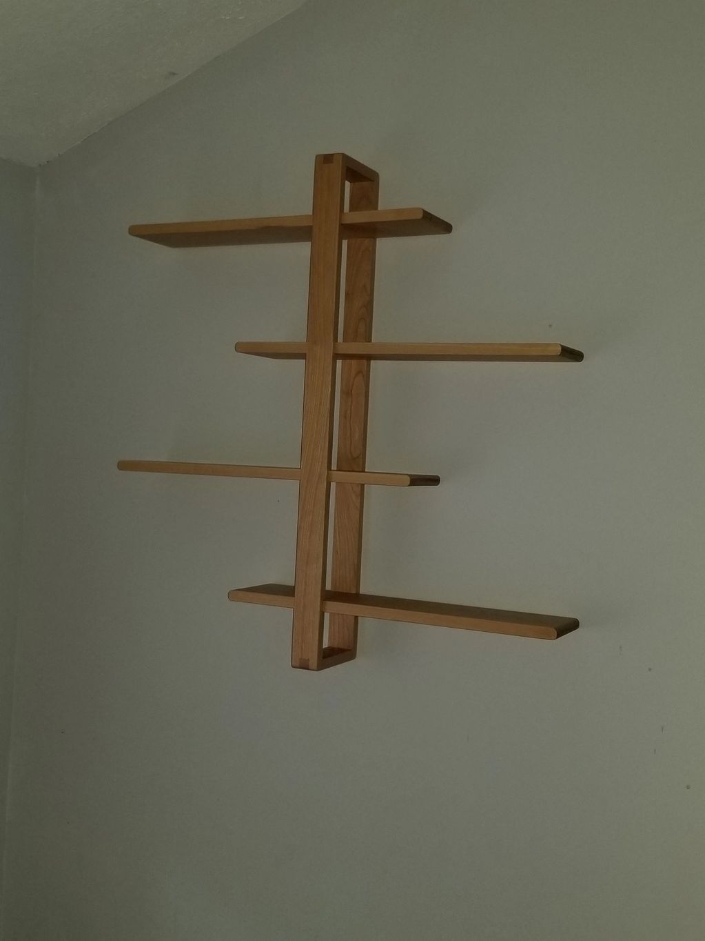 Custom built shelves. Each of the four shelves adjust left or right depending on the desired effect.