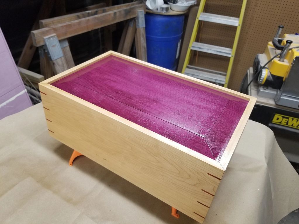 Commissioned for a grieving family, this solid maple box features a purpleheart lid and redheart splines to accent the favorite colors of the person of memory.